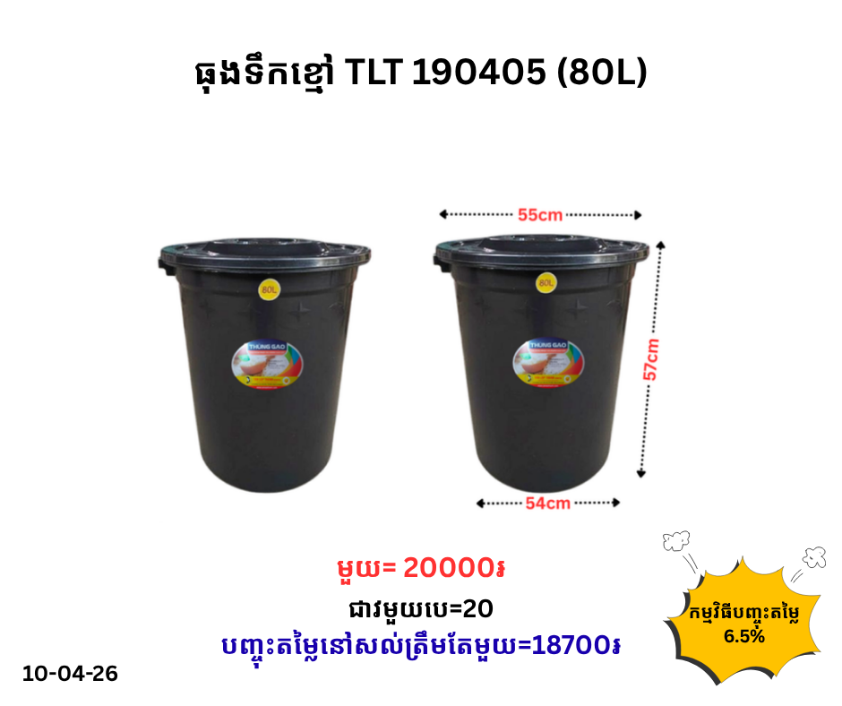 ធុងទឹកខ្មៅ TLT 190405 (80L) December 24, 2025 Posted in 18700, TLT, ធុងទឹក, ធុងទឹកខ្មៅ, ធុងទឹកខ្មៅ TLT តម្លៃ: 20000 ៛ បញ្ចុះតម្លៃ: 18700 ៛ (ទិញចាប់ពីចំនួន 20 ឡើងទៅ) Barcode: P0008534 | Factory: 190405