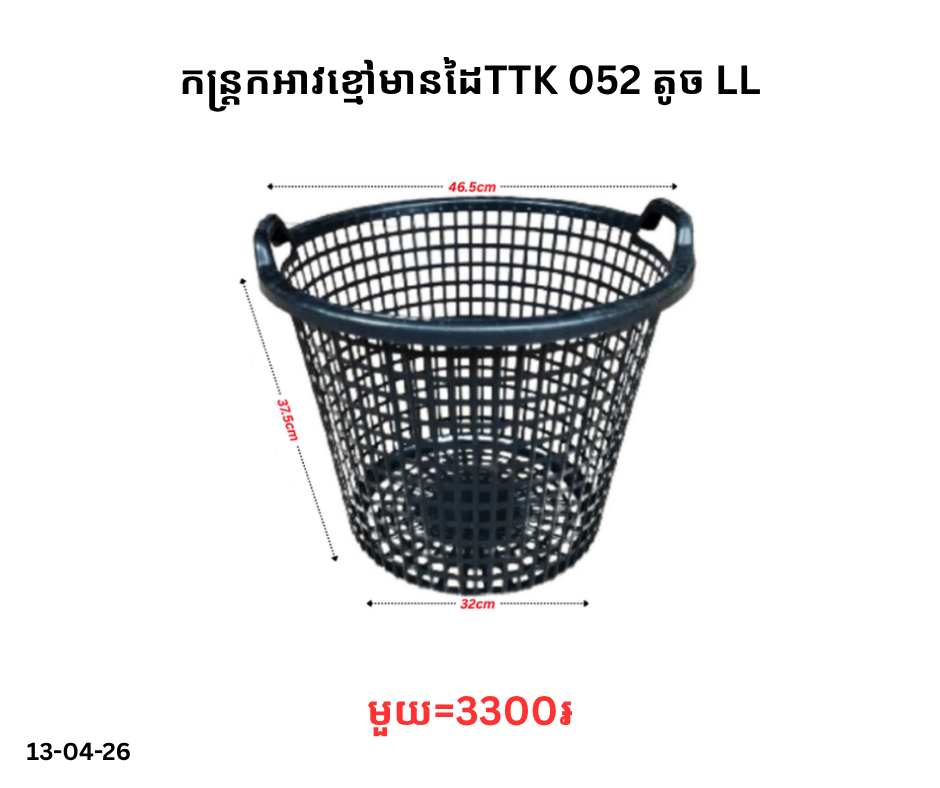 កន្ត្រកអាវខ្មៅមានដៃTTK 052 តូច LL December 21, 2025 Posted in 3300, TTK, កន្ត្រកអាវ, កន្ត្រកអាវ TTK, កន្ត្រកអាវខ្មៅ, កន្ត្រកអាវមូល តម្លៃ: 3300 ៛ Barcode: P0007096 | Factory: 📦លេខកូដសម្គាល់ទំនិញ 🆔 Product ID: 4760151 🔣 Barcode / Code: P0007096 📊 ស្ថានភាពស្តុក៖ មានស្តុក