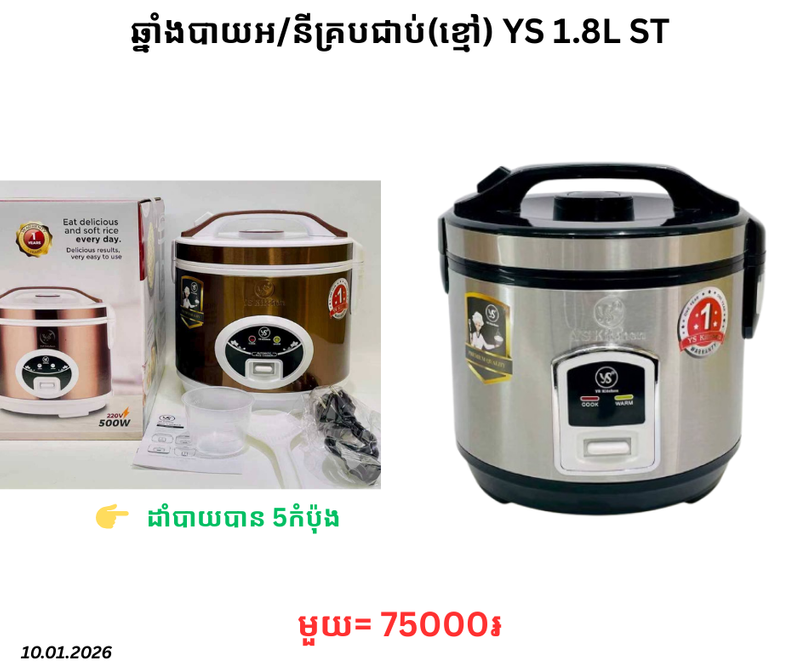 ឆ្នាំងបាយអ/នីគ្របជាប់(ខ្មៅ) YS 1.8L ST January 10, 2026 Posted in 75000, CN, ST, ឆ្នាំង, ឆ្នាំងបាយ, ឆ្នាំងបាយអ/នី, ឆ្នាំងបាយអ/នីគ្របជាប់, ទំនិញថ្មី