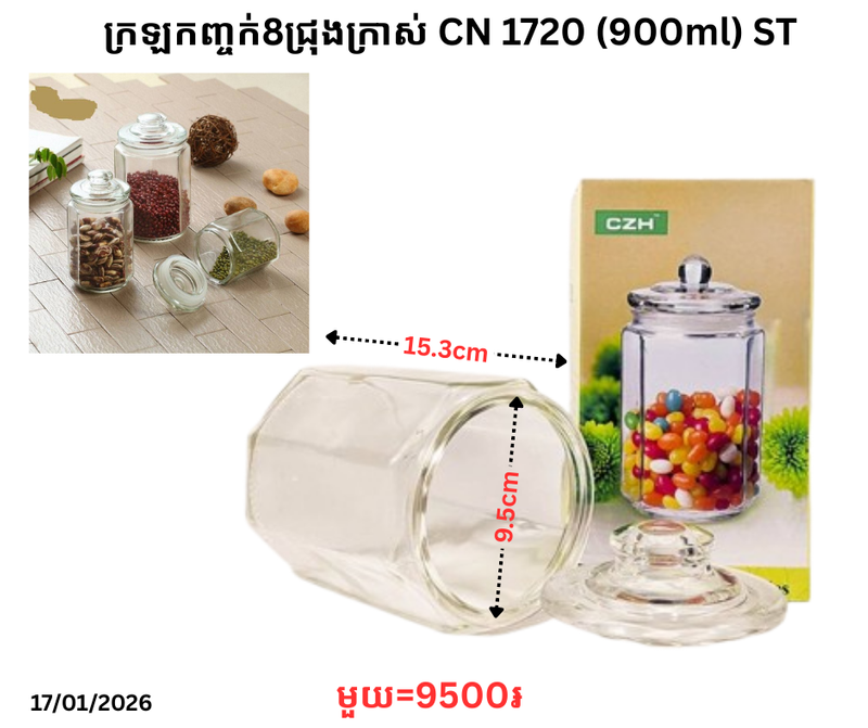 ក្រឡកញ្ចក់8ជ្រុងក្រាស់ CN 1720 (900ml) ST January 22, 2026 Posted in 9500, CN, ST, ក្រឡ, ក្រឡកញ្ចក់, ក្រឡកញ្ចក់8ជ្រុង, ក្រឡកញ្ចក់8ជ្រុងក្រាស់ CN, ទំនិញថ្មី Barcode : 17202
