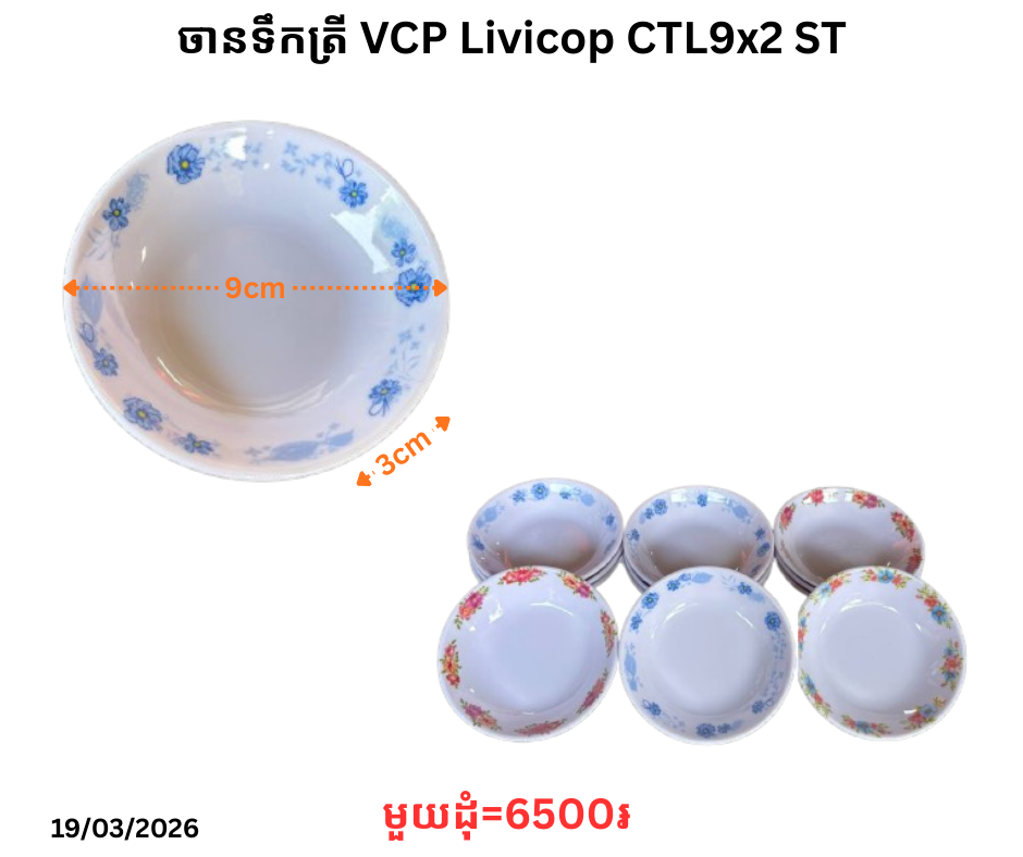ចានទឹកត្រី VCP Livicop CTL9x2 ST March 19, 2026 Posted in 6500, TL, ចានទឹកត្រី, ចានទឹកត្រី TL តម្លៃ: 6500 ៛ Barcode: P0009113 | Factory: