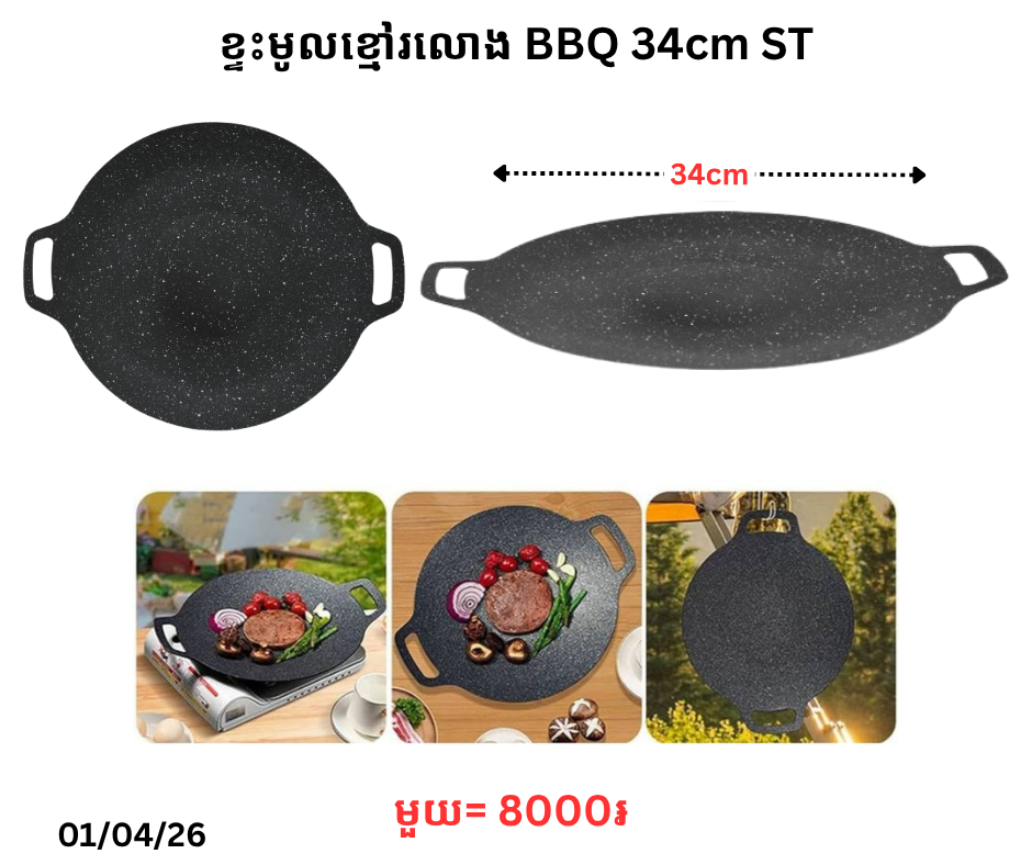 ខ្ទះមូលខ្មៅរលោង BBQ 34cm ST April 1, 2026 Posted in 8000, ខ្ទះ, ខ្ទះមូលខ្មៅរលោង, ខ្ទះអាំង តម្លៃ: 8000 ៛ Barcode: P0009145 | Factory: