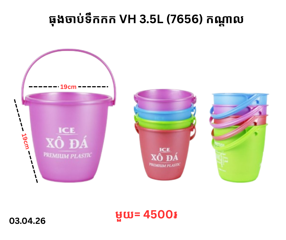 ធុងចាប់ទឹកកក VH 3.5L (7656) កណ្ដាល April 3, 2026 Posted in 4500, VH, ធុងចាប់ទឹកកក, ធុងចាប់ទឹកកក VH តម្លៃ: 4500 ៛Barcode: 8935124576563 | Factory:
