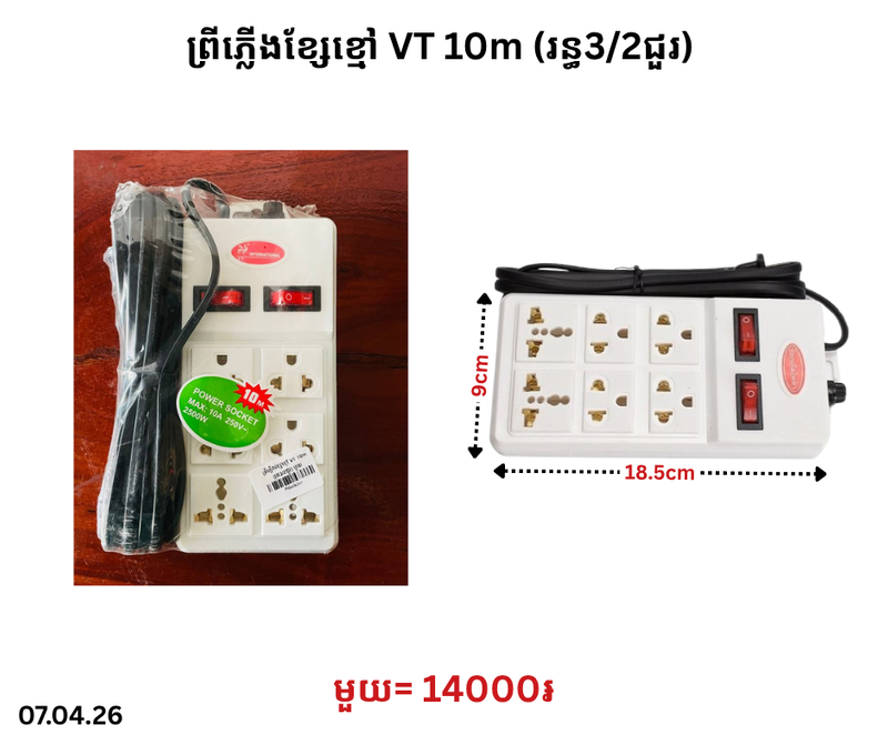 ព្រីភ្លើងខ្សែខ្មៅ VT 10m (រន្ធ3/2ជួរ) April 7, 2026 Posted in 14000, VT, ព្រីភ្លើង, ព្រីភ្លើងខ្សែខ្មៅ, ព្រីភ្លើងខ្សែខ្មៅ VT តម្លៃ: 14000 ៛ Barcode: P0009204 | Factory: