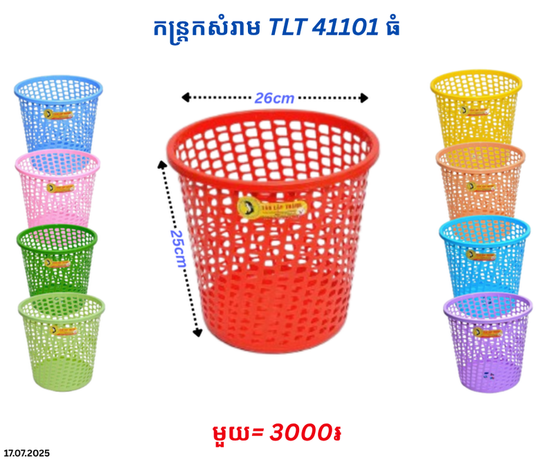 កន្ត្រកសំរាម TLT 41101 ធំ November 17, 2025 Posted in 3000, TLT, កន្ត្រកសំរាម, កន្ត្រកសំរាម TLT តម្លៃ: 3000 ៛ Barcode: P0007903 | Factory: