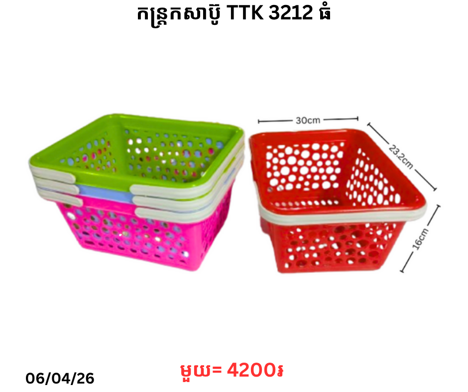 កន្ត្រកសាប៊ូ TTK 3212 ធំ December 21, 2025 Posted in 4200, TTK, កន្ត្រកសាប៊ូ, កន្ត្រកសាប៊ូ TTK តម្លៃ: 4200 ៛ Barcode: P0007001 | Factory: