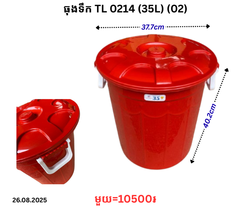 ធុងទឹក TL 0214 (35L) (02) December 24, 2025 Posted in 10500, TL, ធុងទឹក, ធុងទឹក TL Factory Code : 0214