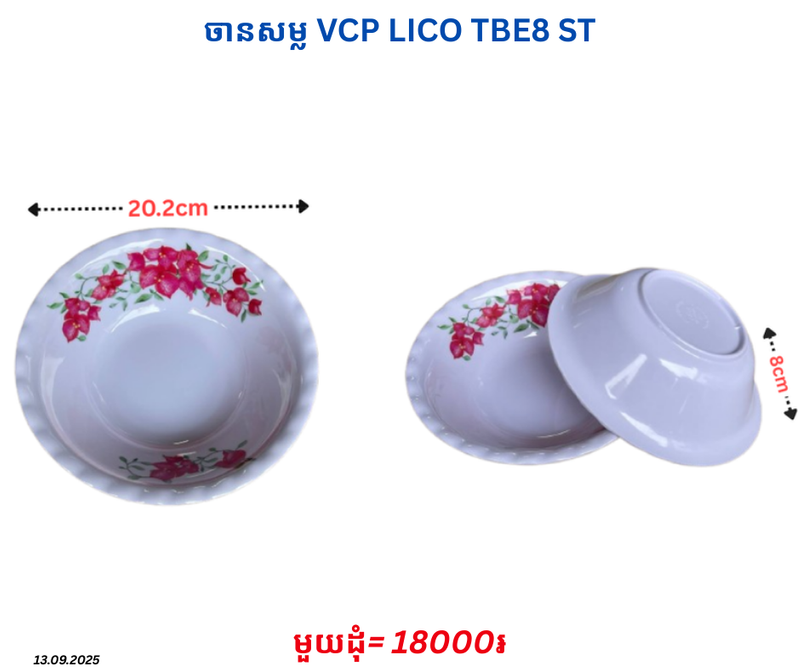 ចានសម្ល VCP LICO TBE8 ST December 6, 2025 Posted in 18000, ST, TL, ចាន, ចានប៉ក់ស៊ីឡែន, ចានសម្ល, ចានសម្ល TL តម្លៃ: 18000 ៛Barcode: P0008469 | Factory: Factory Code : TBE8