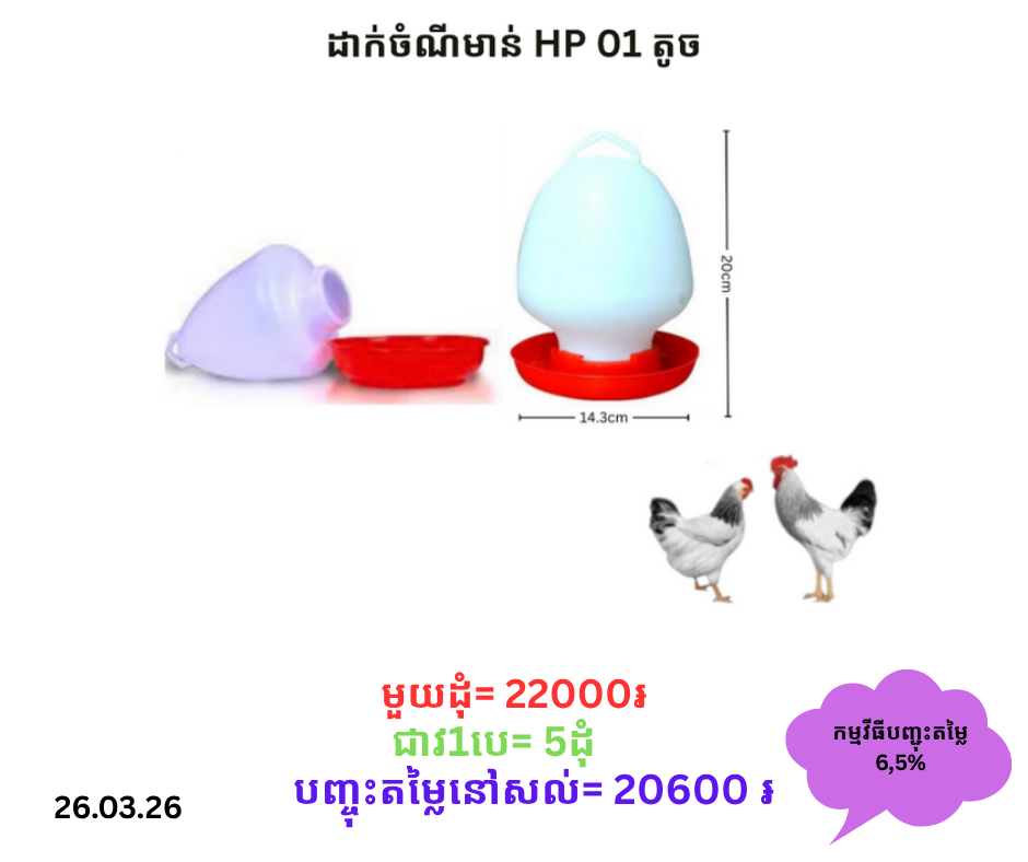 ដាក់ចំណីមាន់ HP 01 តូច November 24, 2025 Posted in 18700, HP, ដាក់ចំណីមាន់, ដាក់ចំណីមាន់ HP តម្លៃ: 22000 ៛ បញ្ចុះតម្លៃ: 20600 ៛ (ទិញចាប់ពីចំនួន 5 ឡើងទៅ) Barcode: P0006921 | Factory: